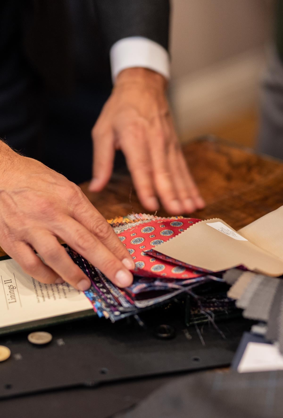 Dalle esclusive mazzette di campioni, che in Prata & Mastrale sono oltre 300, o direttamente dai pregiatissimi tagli presenti sugli scaffali. In questa fase si decidono anche i dettagli di stile e le finiture (fodere, bottoni, etc.).