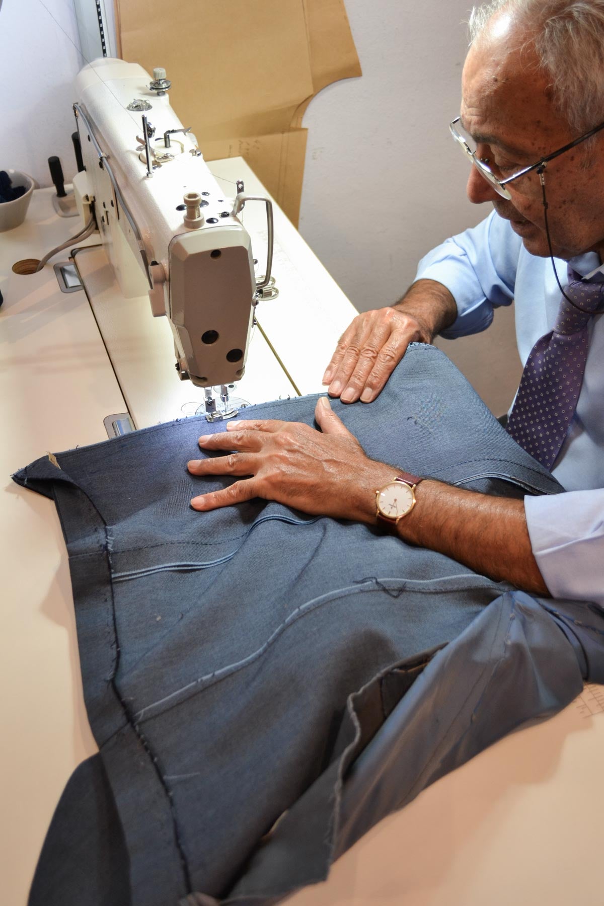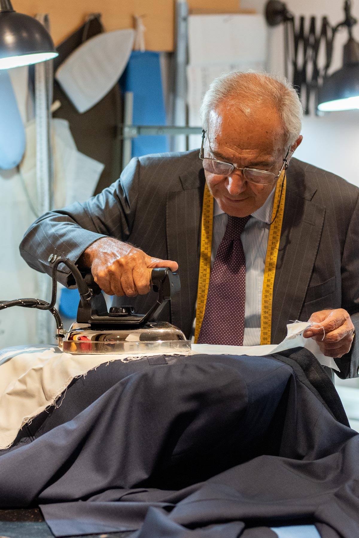 Completata la prova finale gli anziani esperti di Prata & Mastrale stirano ancora gli abiti sotto uno straccio umido, usando il ferro a vapore.