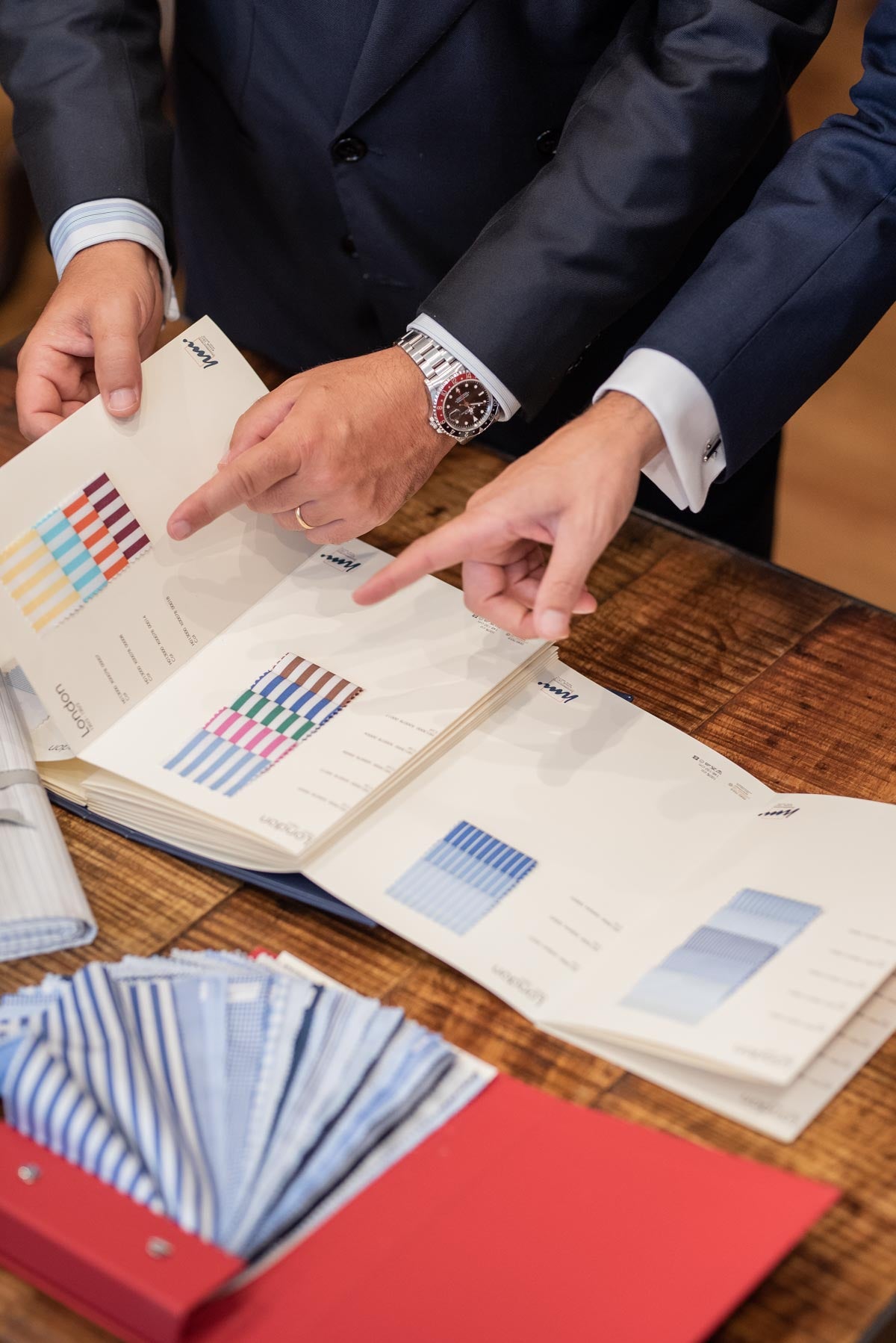 Camicie sartoriali, su misura, rifinite a mano, con cuciture fini e bottoni di madreperla. Sono i dettagli, le personalizzazioni e la stoffa esclusiva (introvabile nelle camicie già confezionate) a dimostrare classe ed eleganza anche nei momenti in cui non si indossa la giacca. I tempi di consegna sono di due settimane.